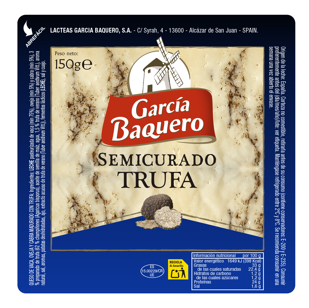LECHE pasteurizada de vaca (min 75%), oveja (min 5%) y cabra (min 5%), 3 % preparado de trufa (62 % champiñones (Agaricus bisporus), aceite de semilla de maíz, agua, 1,5 % trufa de verano (Tuber aestivum Vitt.), aroma natural, sal, aromas, patatas deshidratadas, ajo, extracto acuoso de trufa de verano (Tuber aestivum Vitt.)), fermentos lácticos (LECHE), sal y cuajo. Coadyuvante tecnológico: cloruro de calcio. Origen de la leche: España..